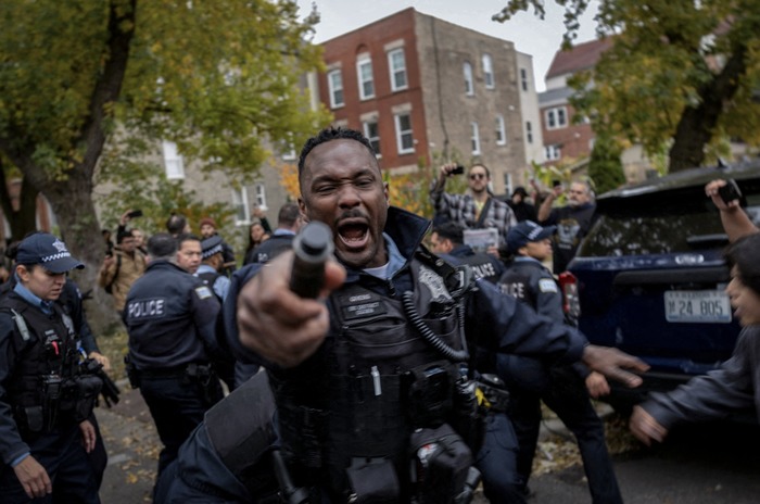 ჩიკაგოს პოლიციის თანამშრომელი რეაგირებს, როდესაც ისინი აკავებენ მამაკაცს (კადრში არ ჩანს) — ფედერალური სამართალდამცავი ორგანოების მიერ ჩატარებული საიმიგრაციო რეიდის შემდეგ მცხოვრებლებთან წარმოქმნილი დაპირისპირების დროს, ლიტლ ვილიჯის უბანში, ჩიკაგო, ილინოისი, აშშ, 2025 წლის 8 ნოემბერი.