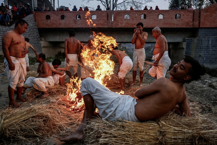 მლოცველები ცეცხლთან იკრიბებიან, სანამ ჰანუმანტეს მდინარეში წმინდა აბაზანას მიიღებენ — Swasthani Brata Katha-ის ფესტივალის ბოლო დღეს, ბჰაქტაპურში, ნეპალი, 2025 წლის 12 თებერვალი.