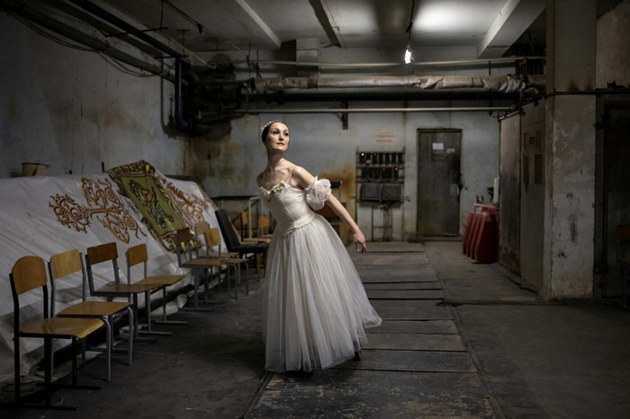 38 წლის ბალერინა ოლენა შლიაჰინა ფოტოსთვის პოზირებს "შოპინიანას" აღდგენის რეპეტიციის შემდეგ — ეროვნული აკადემიური ოპერისა და ბალეტის თეატრის მიწისქვეშა სივრცეში, მიმდინარე თავდასხმების ფონზე, ხარკოვი, უკრაინა, 2025 წლის 27 აპრილი.