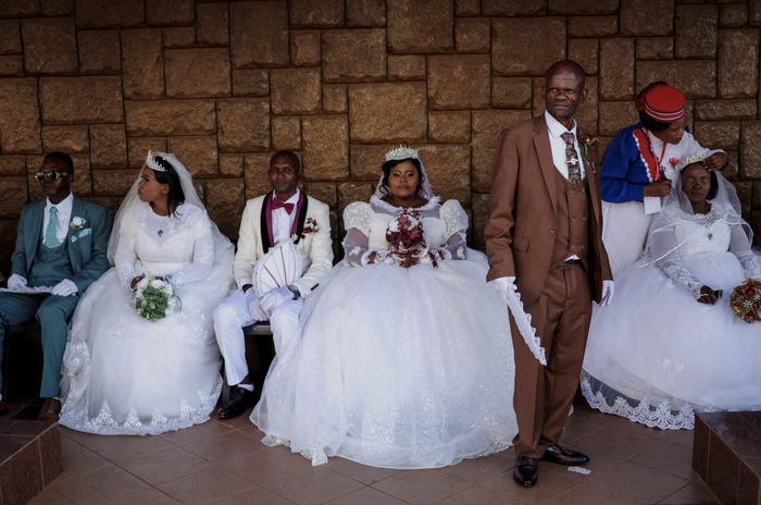 პატარძლები და სიძეები ჩამოდიან მასობრივი ქორწინების ცერემონიაში მონაწილეობის მისაღებად საერთაშორისო პენტეკოსტალურ სიწმინდის ეკლესიაში (IPHC) — ზურბეკომი, იოჰანესბურგის დასავლეთი, სამხრეთ აფრიკა, 2025 წლის 20 აპრილი.