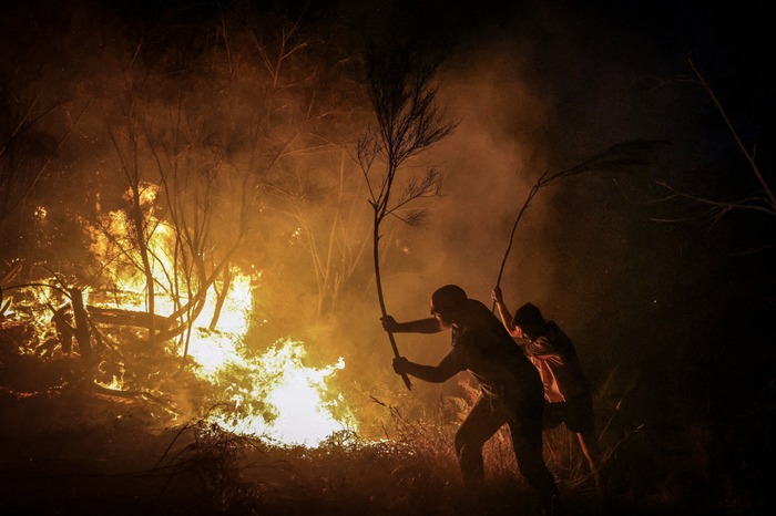 მოსახლეობა ხის ტოტებით ცდილობს ტყის ხანძრის ჩაქრობას — გალისიის რეგიონში, ოურენსეს პროვინცია, ესპანეთი, 2025 წლის 15 აგვისტო.