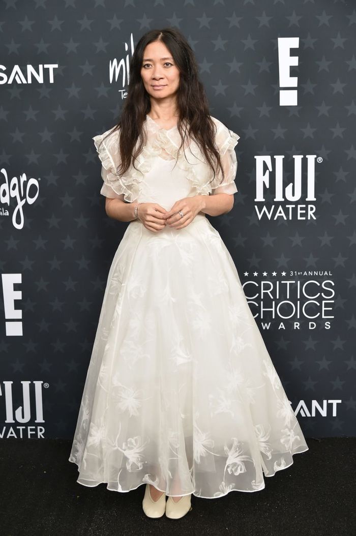 Hamnet-ის რეჟისორმა ქლოე ჟაომ Rodarte-ის 2025 წლის გაზაფხული–ზაფხულის კოლექციიდან შერჩეული, თეთრი შროშანებით დაბეჭდილი კაბა მოირგო:
