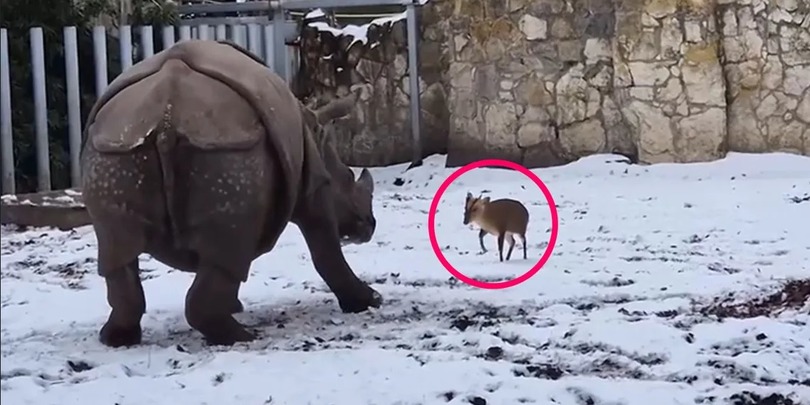სოციალურ ქსელებში ვირუსულად გავრცელებულ ვიდეოში ჩანს, როგორ ესხმის პატარა ირემი თავს ბევრად უფრო დიდ მარტორქას — თავისი პატარა რქებით ეჯახება მის რქიან ცხვირს.