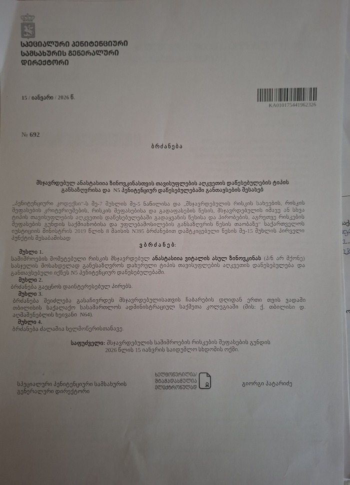 "2026 წლის 16 იანვარს ჩემს დაცვის ქვეშ მყოფთან, ანასტასია ზინოვკინასთან N5 პენიტენციურ დაწესებულებაში ვიზიტისას შევიტყვე, რომ 2026 წლის 15 იანვრის ბრძანებით, ანასტასია ზინოვკინას შუცვალეს თავისუფლების აღკვეთის დაწესებულების ტიპი და განუსაზღვრეს დახურული ტიპის თავისუფლების აღკვეთის დაწესებულება. 2025 წლის 12 სექტემბრიდან ანასტასია მოთავსებული იყო ნახევრად ღია ტიპის თავისუფლების აღკვეთის დაწესებულებაში.