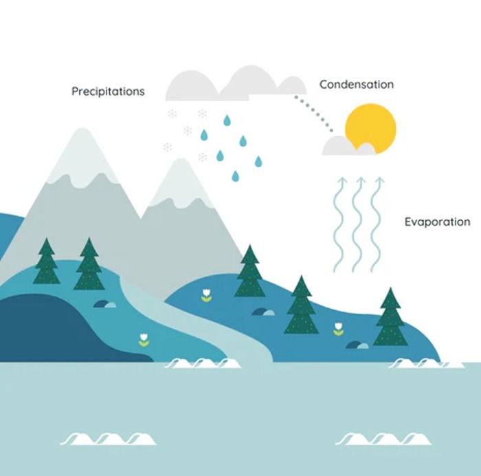 ოკეანეებისა და ტბების წყალი სითბოს ზემოქმედებით ორთქლდება, ხოლო ეს ორთქლი შემდეგ ატმოსფეროში ხვდება. რაც უფრო მაღლა ადის ორთქლი, მით უფრო დაბალ ტემპერატურაზე ხვდება ის. დაბალ ტემპერატურაზე ღრუბლებთან შეხებისას ორთქლი კონდენსირდება და წვეთებად გარდაიქმნება.