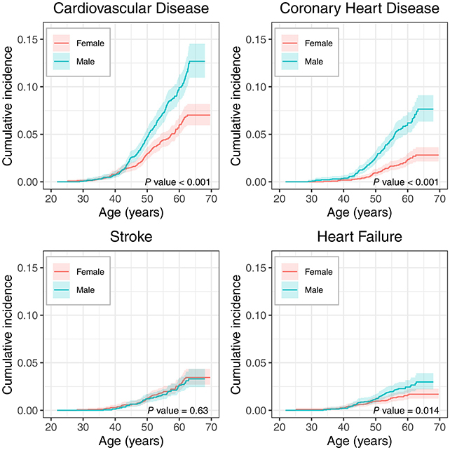 ინსულტის შემთხვევაში სქესთა შორის სხვაობა მცირე იყო. რაც შეეხება გულის უკმარისობას, რა დროსაც გული შესაბამისად ვერ მუშაობს, სიცოცხლის გვიან ეტაპზე ვლინდებოდა.