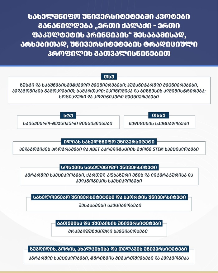 ოცნების ხელისუფლების მიერ შემუშავებული უმაღლესი განათლების რეფორმის კონცეფციის "1 ქალაქი 1 ფაკულტეტის" ფარგლებში სახელმწიფო უნივერსიტეტებში კვოტები ახლებურად გადანაწილდა. ოცნების ხელისუფლების განათლების მინისტრის, გივი მიქანაძის თქმით, კვოტების გადანაწილებისას გათვალისწინებული იქნება უნივერსიტეტების ტრადიციული პროფილი. ამის შესახებ მან ბრიფინგზე განაცხადა.