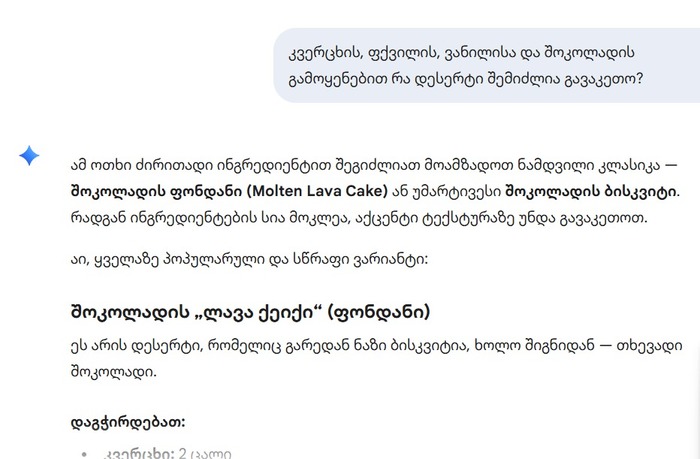 თუკი მას თქვენს მაცივარში შენახული პროდუქტების შესახებ ინფორმაციას მიაწვდით და აღნიშნავთ, რა რაოდენობის ინგრედიენტები გაქვთ, ჩატბოტი რამდენიმე წამში რეცეპტების ნუსხას ჩამოგიწერთ.