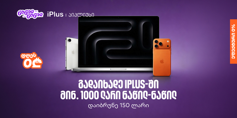 ის მომხმარებლები, რომლებიც 2 და 3 მარტს iPlus-ის ფიზიკურ მაღაზიაში ნაწილ-ნაწილ გადახდით მინიმუმ 1,000 ლარის პროდუქციას შეიძენენ 150 ლარიან ქეშბექს მიიღებენ.