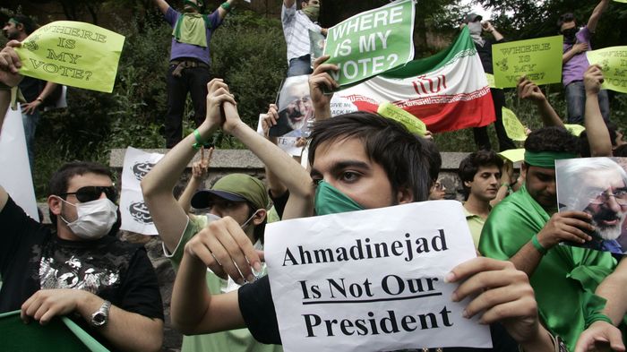 იმავე წლის ივნისში ქუჩაში მილიონობით უკმაყოფილო ირანელი გამოვიდა. ისინი მწვანე სიმბოლიკითა და პლაკატებით — "სად არის ჩემი ხმა?" — სამოქალაქო დაუმორჩილებლობას აცხადებდნენ. როგორც წესი, ხამენეი პოლიტიკურ პროცესებში პირდაპირ არ ერეოდა ხოლმე, თუმცა ამჯერად ის ღიად შეეწინააღმდეგა "მწვანე მოძრაობას". ამ პროტესტში მან იმპერიალისტური ძალების მიერ მართული "ხავერდოვანი რევოლუცია" დაინახა, რომლის მიზანიც ისლამური რესპუბლიკის დამხობა იყო. მიუხედავად საერთო იდეოლოგიისა, საბოლოოდ, ხამენეის კეთილგანწყობა აჰმადინეჟადმაც დაკარგა.