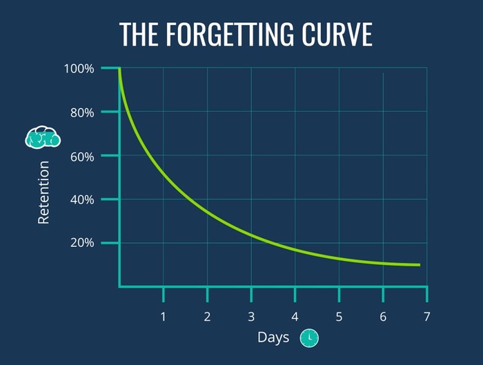 ჯერ კიდევ 1885 წელს ფსიქოლოგმა ჰერმან ებინგჰაუსმა შეიმუშავა დავიწყების მრუდი, რომელიც აჩვენებს, რომ ახალნასწავლი ინფორმაციის დაახლოებით 50% გვავიწყდება 1 დღეში, 1 კვირაში კი ნასწავლის 90% აღარ გვახსოვს. ეს იმიტომ ხდება, რომ ჩვენი ტვინი ენერგიას ზოგავს და ყველაფერს, რასაც არ ვიყენებთ, ასე ვთქვათ, ნაგავში ყრის.