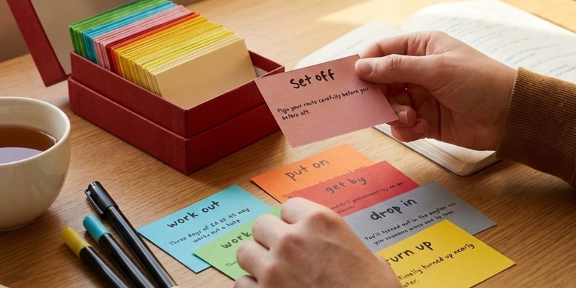 თუ სიტყვების ხელით ამოწერა გიყვარს და ეს გეხმარება დამახსოვრებაში, vocabulary ბლოკნოტი შეგიძლია მთლიანად ჩაანაცვლო ბარათების დასტებით. ბარათის ერთ მხარეს წერ სიტყვას ან ფრაზას, მეორე მხარეს კი განმარტებას. შემდეგ შეგიძლია ეს ბარათები ატრიალო და შეეცადო, რომ განმარტების მიხედვით გამოიცნო სიტყვა ან პირიქით. ეს ბლოკნოტზე ეფექტურია, რადგან გაძლევს სიტყვების დახარისხების საშუალებას, დამახსოვრებული სიტყვები გადაგაქვს ცალკე დასტაში, ის სიტყვები კი რომლებსაც ჯერ კიდევ სწავლობ, ცალკე დასტაში გაქვს. ასევე შეგიძლია თემატური დასტები გააკეთო.