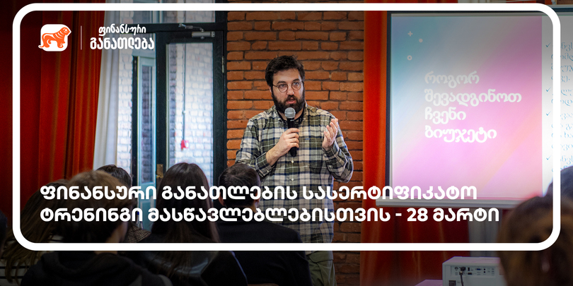 28 მარტს, 13:00 საათზე სკოლის მასწავლებლებისთვის ფინანსური განათლების სასერტიფიკატო კურსი ჩატარდება. ინიციატივის მხარდამჭერი საქართველოს ბანკია.
