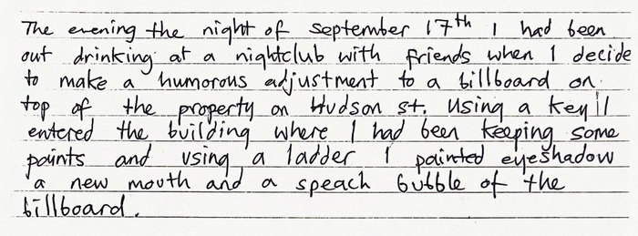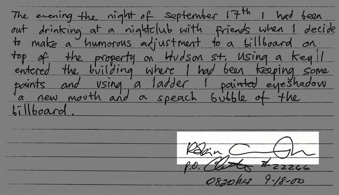 ნიუ-იორკში ბილბორდთან დაკავშირებული ინციდენტის გამო დაკავების შემდეგ, ბენქსიმ აღიარა სარეკლამო აბრის დაზიანება ამ ხელნაწერ აღიარებით ჩვენებაში, რომელიც პოლიციისთვის იყო განკუთვნილი და მანამდე არასდროს გამოქვეყნებულა.