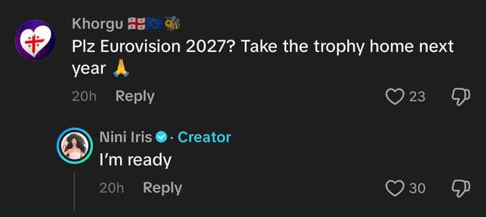 ტიკტოკზე უახლესი ვიდეოს კომენტარებში კი ქართველ მომღერალს ჰკითხეს, ისევ განიხილავდა თუ არა ევროვიზიის სიმღერის კონკურსზე მონაწილეობას. "მზად ვარ", — უპასუხა ნინიმ.