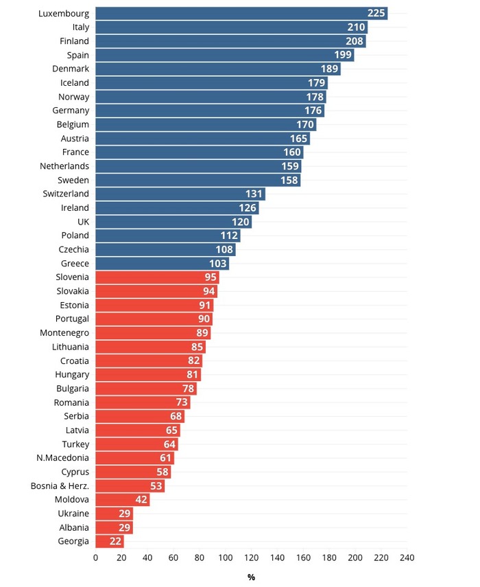 "ყველაზე დაბალი დაფარვა, 22% საქართველოშია. ყველაზე მაღალი, 225% ლუქსემბურგში, სადაც საშუალო პენსია €28790-ია, ხოლო ცხოვრების ხარჯები €12,791-ს შეადგენს, ანუ პენსია თითქმის ორჯერ აღემატება საჭიროებას.