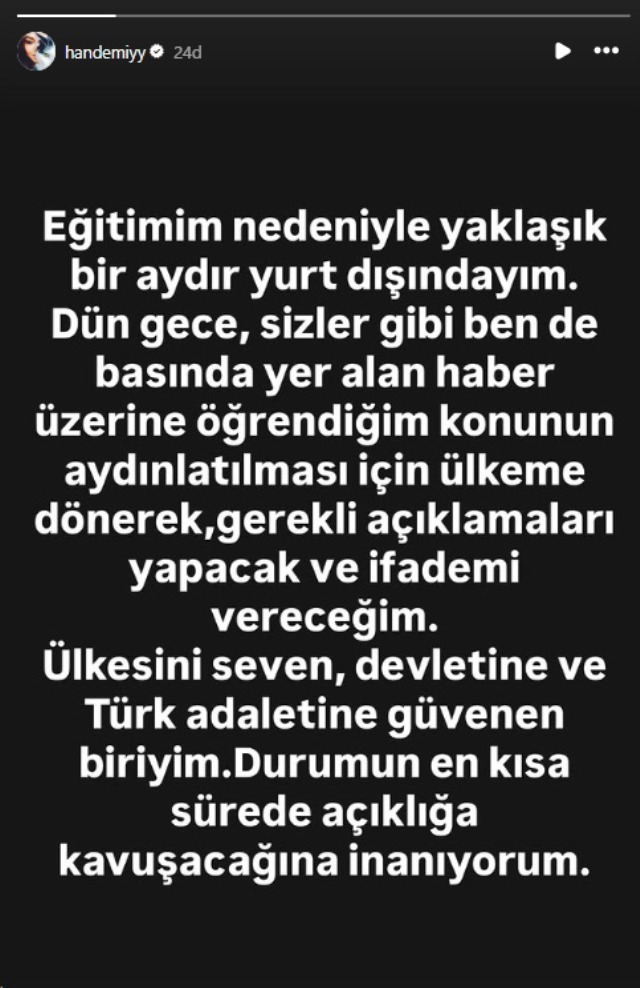 მსახიობს ექსპერტიზაზე თმისა და სისხლის ნიმუშები უნდა აუღონ. აქვე შეგახსენებთ, რომ 25 მარტს ჰანდე ერჩელის დაკავების ორდერი გაიცა. ამ საქმეზე დაკავებულია 14 ადამიანი საფეხბურთო კლუბ გალათასარაის ყოფილი პრეზიდენტი, ბერიქთაშის ყოფილი თავმჯდომარე, ჰაკან და კერიმ საბანჯები, მოდელები დიდემ სოიდანი, გუზიდე დურანი და სხვები.