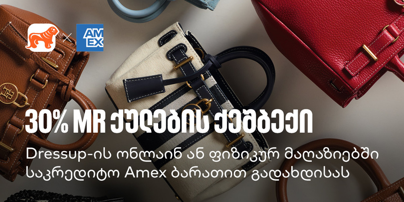 მიიღეთ 30% MR ქულების ქეშბექი Dressup-ში საქართველოს ბანკის Amex ბარათით გადახდისას მიიღეთ 30% MR ქულების ქეშბექი Dressup-ში საქართველოს ბანკის Amex ბარათით გადახდისას