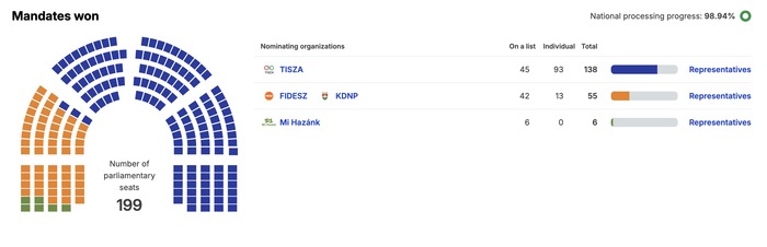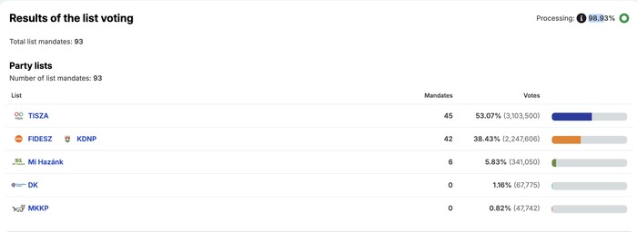 უნგრეთის საპარლამენტო არჩევნებზე ხმების 98.9% უკვე დათვლილია. პეტერ მადიარის პარტია Tisza-მ ხმების 53 მოიპოვა, რაც პარლამენტში 138 მანდატის მიღებას ნიშნავს. ვიქტორ ორბანის პარტია Fidesz-მა კი —38%-ის (55 მანდატი). ამ შედეგებით, Tisza-ს პარტიამ და მისმა 45 წლის ლიდერმა პეტერ მადიარმა უნგრეთის პარლამენტში ხმების ორ მესამედზე მეტის მიღება შეძლო.