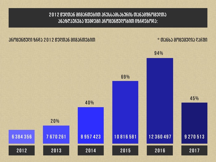 ორგანიზაციის ინფორმაციით, 2012-2017 წლებში სახელმწიფო უწყებების პრესსამსახურების ანაზღაურებაში 55,44 მილიონი ლარი დაიხარჯა, საიდანაც 2012 წელს მხოლოდ 10 პროცენტი - 5,69 მილიონი. სწორედ ამ წლის ოქტომბერში შეიცვალა ხელისუფლება და მმართველი ძალა ქართული ოცნება გახდა. ამავე წლებში პრესსამსახურის თანამშრომელთა რაოდენობა 423-დან 643-მდე გაიზარდა.