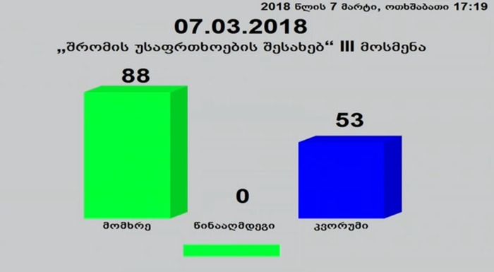 საქართველოს პარლამენტმა დღეს, 7 მარტის პლენარულ სესიაზე შრომის უსაფრთხოების შესახებ კანონი მესამე მოსმენით მიიღო, 88 ხმით არცერთის წინააღმდეგ.