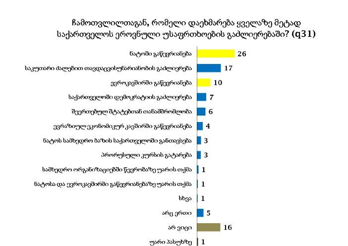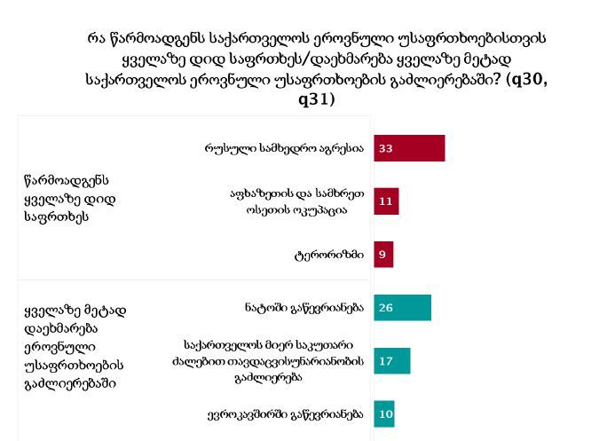 NDI-ის კვლევის მიხედვით, მოსახლეობის 26 პროცენტი ფიქრობს, რომ საქართველოს ეროვნული უსაფრთხოების გაძლიერებაში ნატოში გაწევრიანება დაეხმარება.