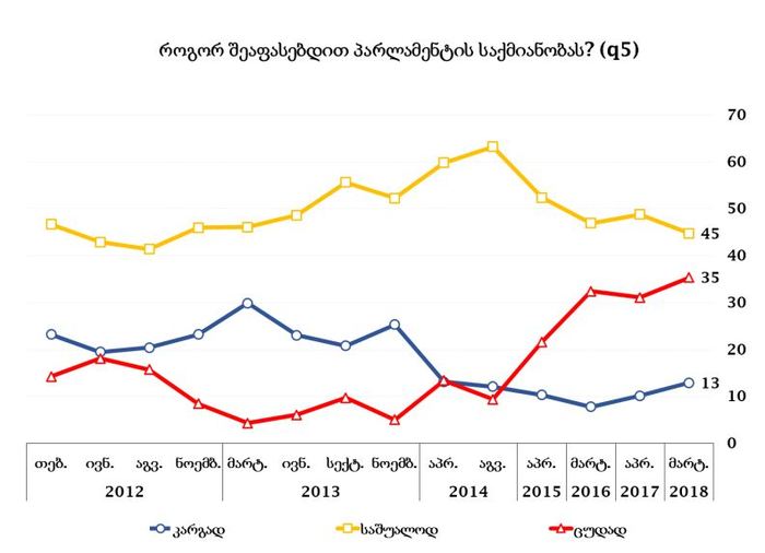 NDI-ს კვლევის მიხმიხედვით, საქართველოს პარლამენტის საქმიანობას მოსახლეობის 35 პროცენტი უარყოფითად აფასებს, ხოლო დადებითად - 13 პროცენტი.