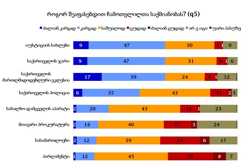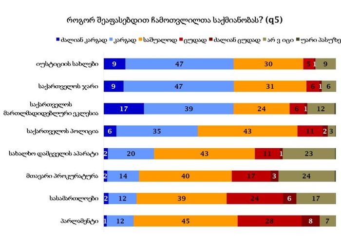 სასამართლოების საქმიანობას უარყოფითად აფასებს 30 პროცენტი, პარლამენტისას 36 პროცენტი.