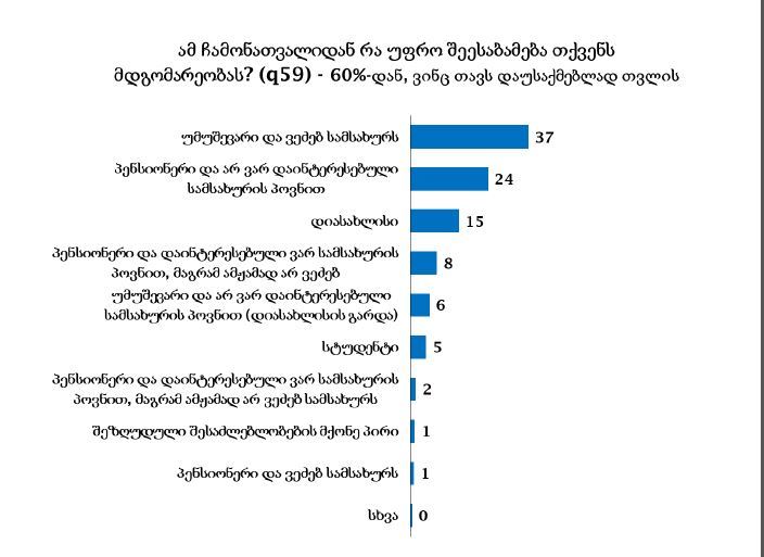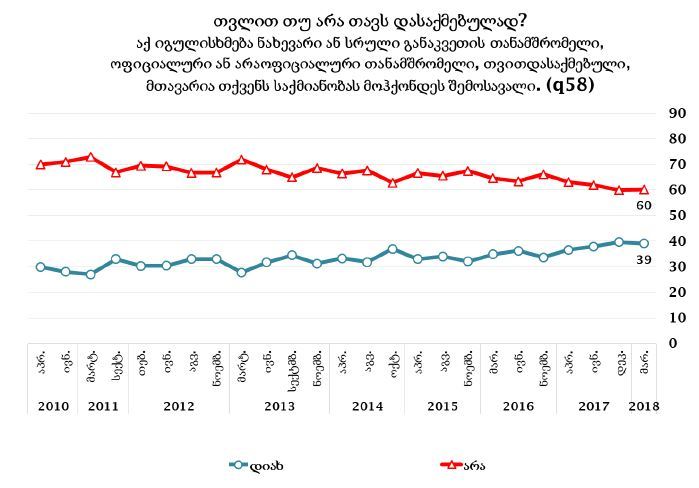 NDI-ის კვლევის მიხედვით, გამოკითხულთა 60 პროცენტს მიაჩნია, რომ დასაქმებული არ არის. 39 პროცენტის თქმით, კი დასაქმებულია.