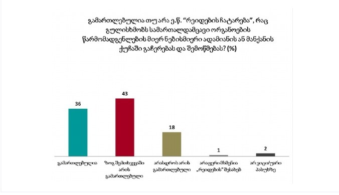 გამოკითხულთა 43%-ის აზრით, ჩხრეკა ზოგიერთ შემთხვევაში არის გამართლებული. 18 % კი ფიქრობს, რომ რეიდები არასდროს არის გამართლებული.