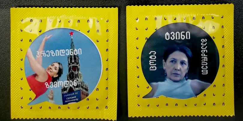 პრეზერვატივების შეფუთვაზე საპრეზიდენტო კანდიდატის ცნობილი ციტატებია დატანილი. შეფუთვებს შორისაა ზურაბიშვილის ფოტო კრემლის ფონზე და რუსეთის საგარეო საქმეთა მინისტრ სერგეი ლავროვთან ერთად.