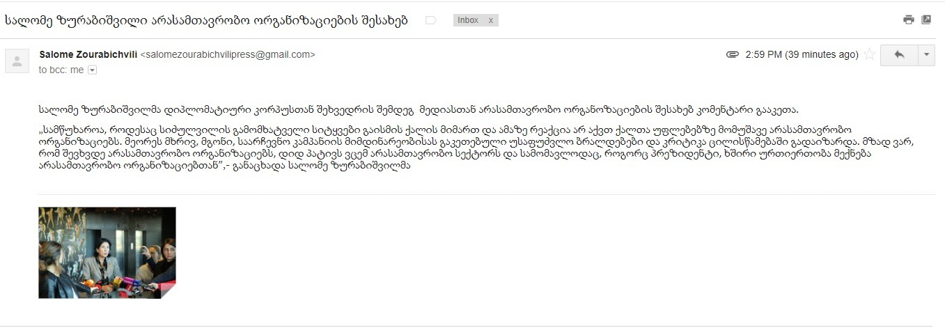 დღეს, 6 ოქტომბერს დიპლომატიურ კორპუსთან შეხვედრის შემდეგ მმართველი პარტიის საპრეზიდენტო კანდიდატმა, სალომე ზურაბიშვილმა არასამთავრობო ორგანიზაციების შესახებ ისაუბრა. On.ge-მ ზურაბიშვილის პრესსამსახურიდან მეილით მიიღო შეტყობინება, რომელშიც კანდიდატის კომენტარია გამოგზავნილი.