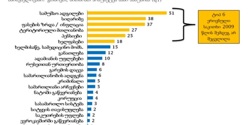 ეროვნულ-დემოკრატიული ინდტიტუტის (NDI) კვლევის მიხედვით, 2009 წლის შემდეგ პირველი ექვსი ყველაზე მნიშვნელოვანი ეროვნული საკითხების ჩამონათვალი უცვლელი რჩება.