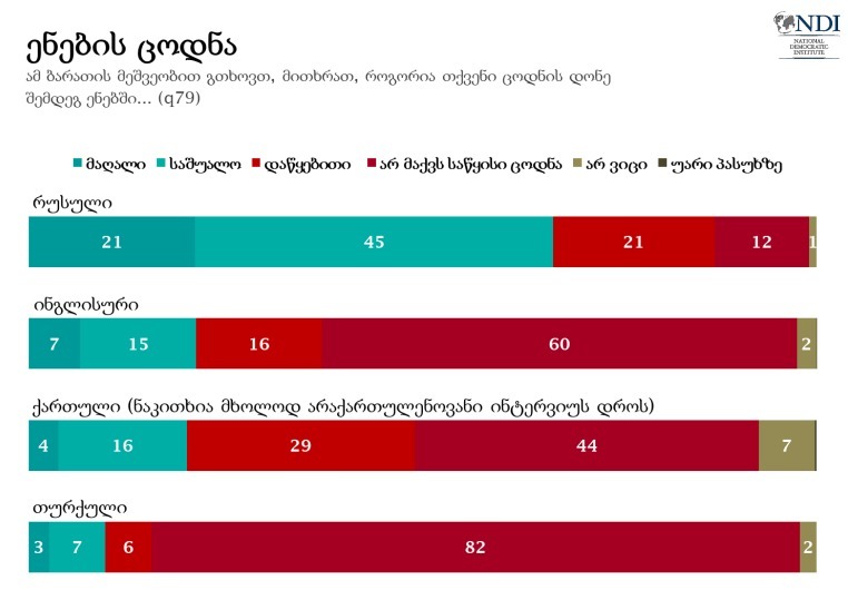 გამოკითხულთა იმ ჯგუფიდან, რომლებთანაც ინტერვიუ არაქართულ ენაზე წარიმართა, 44 პროცენტს ქართული ენის საწყისი ცოდნა არ აქვს. მათგან ქართული ენა მაღალ დონეზე მხოლოდ 4-მა პროცენტმა იცის, ხოლო 16-მა პროცენტმა საშუალოდ. ამავე რესპონდენტთა ჯგუფიდან ქართული დაწყებით დონეზე 29 პროცენტმა იცის.