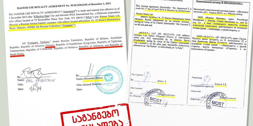 "ჩვენთვის ცნობილი ამ ხელშეკრულების რუსული სქემის და მისი საგანგაშო დეტალების შესახებ. კომპანია MOST-მა (ს/კ: 402121477 რეგისტრაციის თარიღი: 20.03.2019 დირექტორი და 49 პროცენტის წილის მფლობელი დავით ხუჯაძე, რომელიც ამავდროულად არის GERA-ს ერთ-ერთი დამფუძნებელიც, რაც ინტერესთა კონფლიქტია) რეგისტრაციიდან 10 დღეში, 2019 წლის პირველ აპრილს გააფორმა ხელშეკრულება არა Warner Music-ის სათავო ოფისთან, არამედ მის რუსეთის დანაყოფთან (დირექტორი ალექსანდრე ბლინოვი) რუსეთის დანაყოფს კი, საკუთარი დაფარვის ტერიტორიად, საქართველოსთან ერთად, მითითებული აქვს აფხაზეთი და სამხრეთ ოსეთი, როგორც დამოუკიდებელი სახელმწიფოები", — ნათქვამია საავტორო უფლებათა ასოციაციის განცხადებაში.