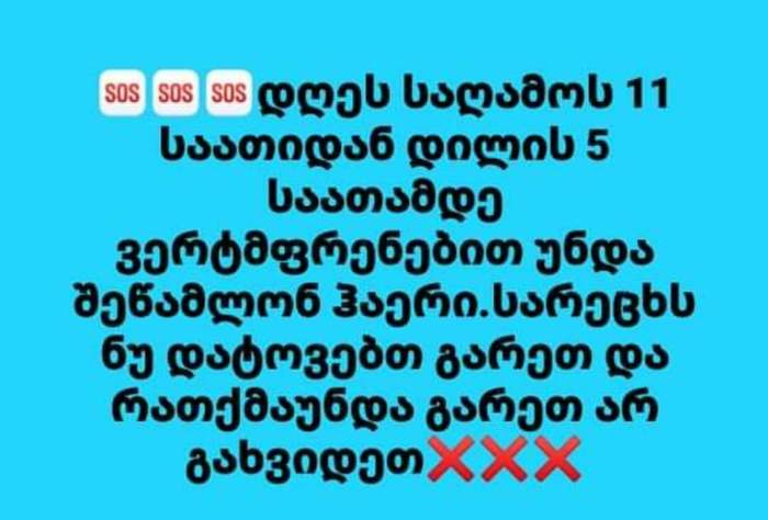 დღეს, 11 მარტს ფეისბუქით გავრცელდა ინფორმაცია, რომ 23:00 საათიდან დილის 05:00 საათამდე თბილისი სადეზინფექციო ხსნარით ვერტმფერენებიდან უნდა შეიწამლოს.