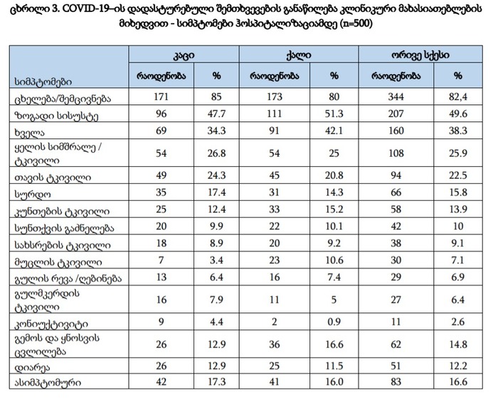 მონაცემების მიხედვით, იმპტომებიდან ყველაზე ხშირად ცხელება ვლინდება. კერძოდ, 82,4 პროცენტში. ასევე, ხშირია ზოგადი სისუსტე — 49,6%, ხველა — 38,3% და ყელის ტკივილი — 25,9%.