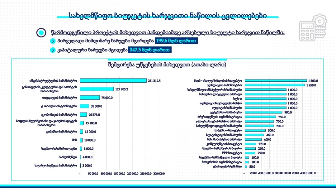 მთავრობის ანტიკრიზისული გეგმის პრეზენტაციაზე მან წარმოადგინა სია, რომელი სამინისტროს ბიუჯეტი რამდენით შემცირდება: