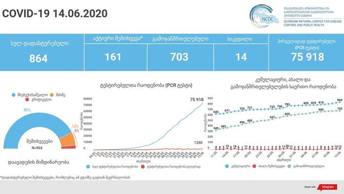 ამ ეტაპისთვის სულ გამოვლენილია კორონავირუსის 864 შემთხვევა, რომელთაგან 703 უკვე გამოჯანმრთელებულია.