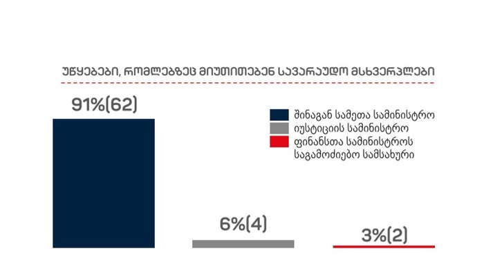 სახელმწიფო ინსპექტორის ანგარიშის თანახმად, იმ შეტყობინებათა 91%-ში, რომლებზეც მათ გამოძიება დაიწყეს, სავარაუდო მსხვერპლები, შესაძლო დანაშაულებრივი ქმედების ჩამდენ პირებად, შსს-ს თანამშრომლებს უთითებენ. მათივე მონაცემებით, 6 პროცენტში ფიგურირებენ სპეციალური პენიტენციური სამსახურის თანამშრომლები, ხოლო 3 პროცენტის შემთხვევაში — ფინანსთა სამინისტროს საგამოძიებო სამსახურის თანამშრომლები.