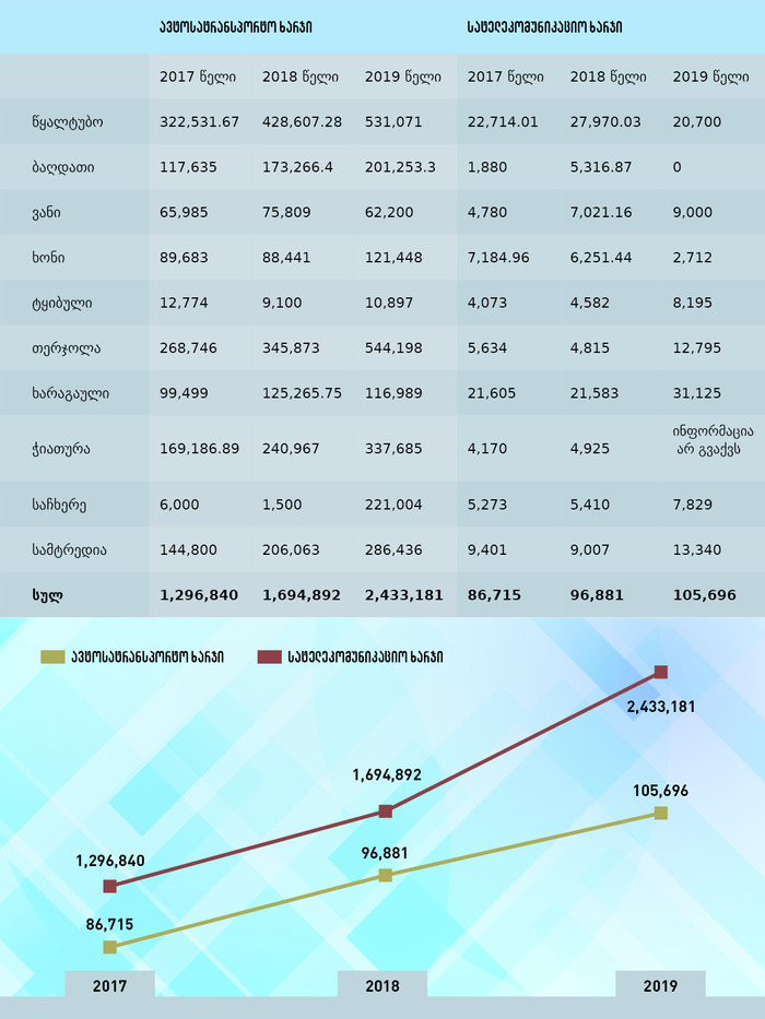TI-ის ინფორმაციით, ყველაზე მეტი ხარჯი ტელეკომუნიკაციაზე ხარაგაულის და წყალტუბოს მუნიციპალიტეტებში გასწიეს. მათგან ხარაგაულის მერიის ა(ა)იპ ე.კიკნაძის სახელობის სკოლამდელ დაწესებულებათა გაერთიანებამ — 12 061 ლარი, ხოლო ა(ა)იპ კულტურის და ხელოვნების ცენტრმა 9 032 ლარი დახარჯა ინტერნეტ და სატელეფონი კომუნიკაციებზე.