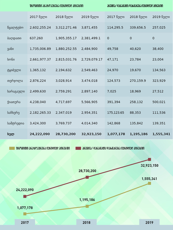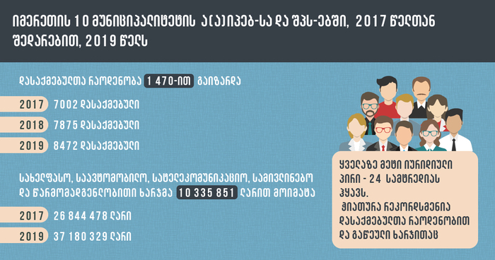 ორგანიზაციის კვლევის თანახმად, იმერეთის ათ მუნიციპალიტეტში 2019 წელს იურიდიულ პირებში დასაქმებულთა შრომით ანაზღაურებაზე 8 701 060 ლარით მეტი დაიხარჯა და მან 32 923 150 ლარი შეადგინა. რაც შეეხება იურიდიულ პირებში დასაქმებულებზე გაცემულ პრემია/დანამატებს, იგი ბოლო სამი წლის განმავლობაში 478 163 ლარით გაიზარდა.