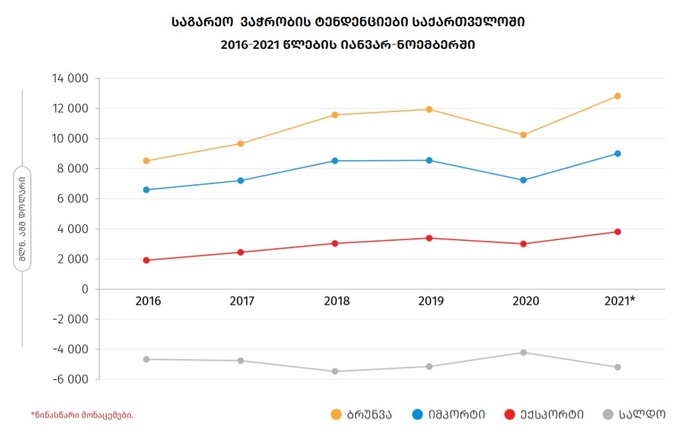 საქსტატის ინფორმაციით, მხოლოდ ნოემბერში საქართველოდან ექსპორტზე 429,8 მილიონის (ზრდა 42,7%) საქონელი გავიდა, ხოლო იმპორტის მოცულობამ 1 მილიარდ დოლარს (ზრდა 40,6%) გადააჭარბა.