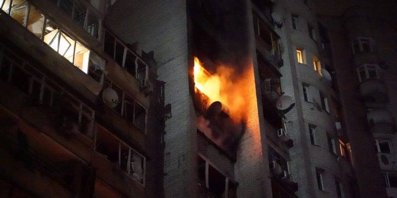 Unian-ის ცნობით, კორპუსს ცეცხლი რუსული სამხედრო თვითმფრინავის ჩამოგდების შედეგად გაუჩნდა — ხანძარი მეოთხედან მეცხრე სართულამდეა.