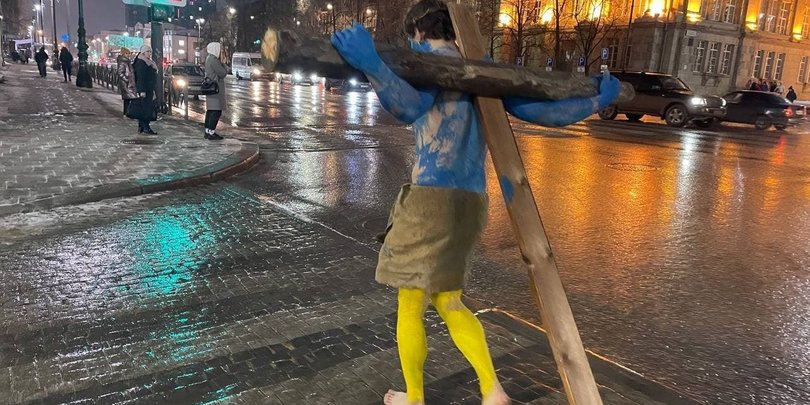 რუსეთის ქალაქ ეკატერინბურგში უკრაინის დროშის ფერებში შეღებილმა და ხისჯვარმოკიდებულმა კაცმა ქუჩებში ერთგვარი მსვლელობა-პერფორმანსი მოაწყო. ამით მან რუსეთის უკრაინაში შეჭრის შემდეგ შექმნილ საომარ სიტუაციაში უკრაინის მხარდაჭერა გამოხატა. თუმცა, მოქალაქე 10 წუთში დააკავეს, ხოლო ჯვარი ტროტუარზე დააგდეს.